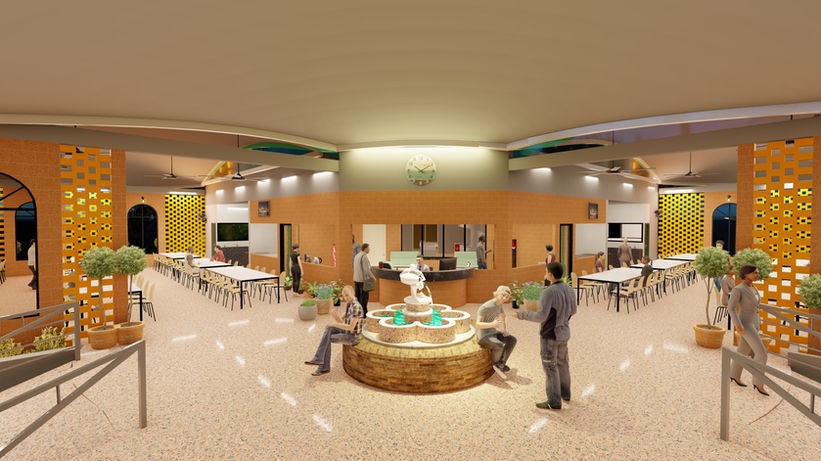 This is a two-storied building in which the ground floor houses a multipurpose hall, office space, and a guest house. The top floor is dedicated for the canteen, which is the primary function of the building. The canteen which is divided into two blocks connected by a central entrance atrium behind which the service area and kitchen facility catering to both the sections is planned.